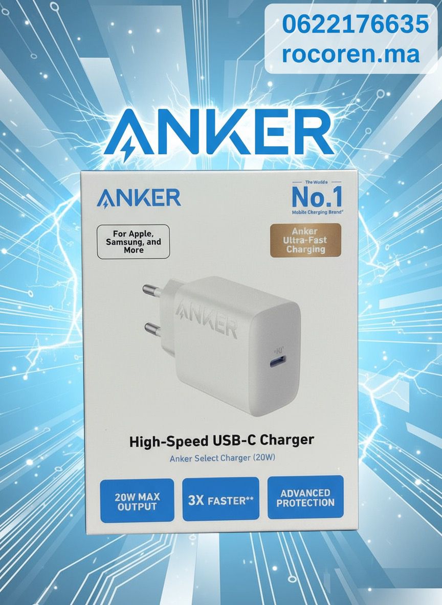 Commandez votre Anker Chargeur 20W USB-C Blanc sur Rocoren.ma ! ⚡ Charge ultra-rapide, format compact, 1 an de garantie, livraison express 24H. Distributeur Officiel Anker au Maroc.