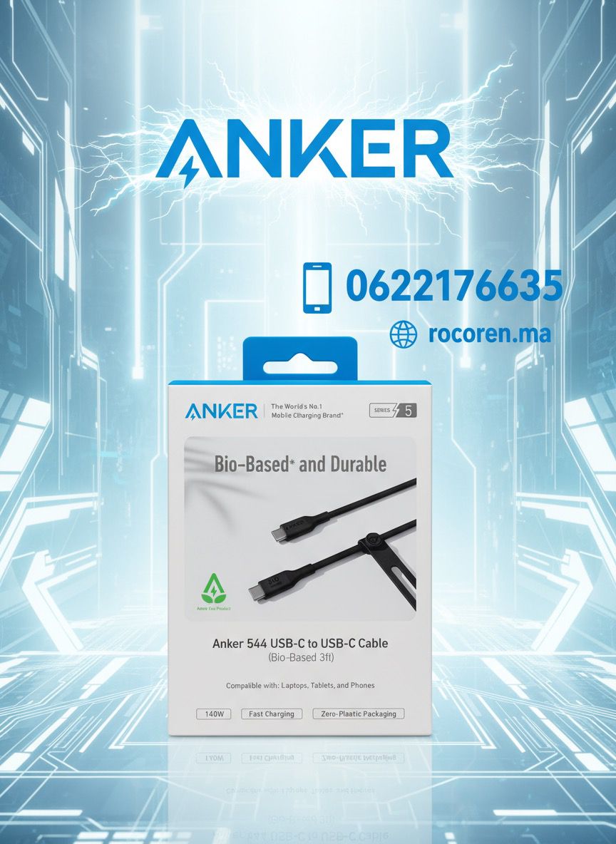 Découvrez le Câble USB-C vers USB-C Anker 544 PowerLine 140W sur Rocoren.ma ⚡ — vitesse de charge extrême, durabilité exceptionnelle et compatibilité universelle. Livraison gratuite partout au Maroc 🇲🇦 et garantie 1 an officielle ANKER.
